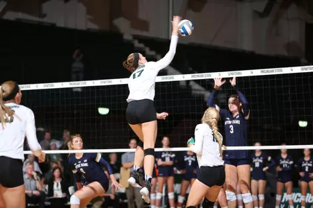 The match featured 27 tie scores and 14 lead changes, and after a two-point victory in the first set, the Spartans looked for some separation in the second frame. An 11-2 run mid-second set helped MSU take a 25-16 victory in that set, but fought through another tight frame in the third, but outlasted their hosts in the third.
