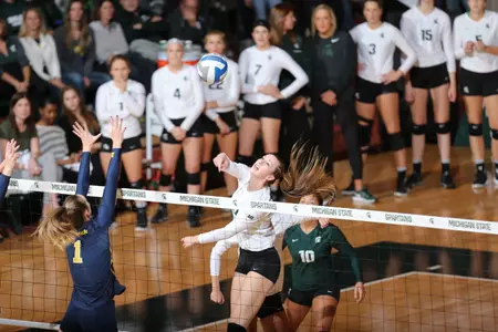 No. 14 Michigan State dropped a 3-0 decision at No. 18 Michigan on Wednesday night, (16-25, 11-25, 30-32) in Ann Arbor, The teams split the season series, but the Wolverines take the State Pride Flag outright for the first time since 2009 with a 4-3 edge in set victories in the season series. MSU falls to 23-8, 12-7 Big Ten, and Michigan is now 22-9, 11-8 in Conference play.