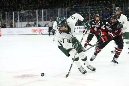 EAST LANSING - The Michigan State hockey team dropped its last home game of the calendar year on Sunday afternoon at Munn Ice Arena, falling to Northeastern, 6-2. The Spartans came back from a 2-0 deficit to tie the game, but the Huskies scored four unanswered goals to pull away, led by Zach Aston-Reese's hat trick.