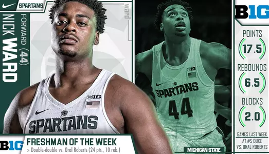 EAST LANSING, Mich. - Michigan State freshman forward Nick Ward has been named Big Ten Freshman of the Week, as announced by the conference office on Monday. Ward averaged 17.5 points and 6.5 rebounds in 20.0 minutes last week in matchups at Duke (11/29) and vs. Oral Roberts (12/3).