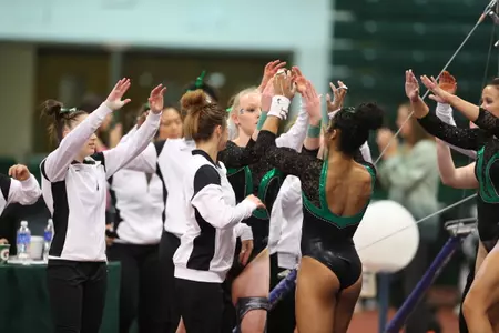 "Tumbles and Takedowns is a very fun and exciting event," said head coach Kathie Klages. "The girls have a lot of fun with it, coming out with the guys in the march in, so it is exciting and I think the fans really enjoy it. I was very disappointed about the competition tonight. We started out extremely rough on vaulting and then we fought back and tried, but we just aren't performing the way we do in the gym. I thought we finished strong on floor, so it was good to see us keep fighting, but we are better than this and we need to start proving it on the competition floor."