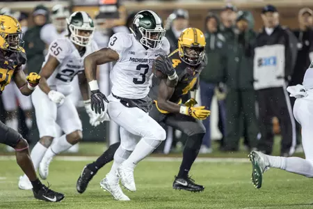 Michigan State forced two turnovers, giving the Spartans nine forced turnovers in the first three games of the Big Ten season . . . Kenny Willekes recovered a fumble in the first quarter, setting up MSU's first TD of the game, a 3-yard run by London, while Khari Willis recorded his first career interception and returned it 19 yards in the second quarter.