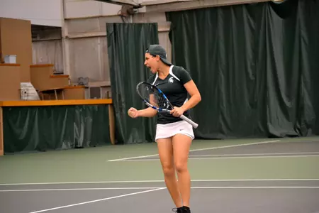 MSU went right to work in the singles matches to secure the victory, starting with Trouillot who won in straight sets on court six, 6-0, 6-1. She has now won five straight matches and is 12-4 on the year. Nguyen won her fourth consecutive match with a 6-2, 6-1 victory at fourth singles, before Lexi Baylis picked up her 10th win of the year with a 6-2, 6-1 victory at fifth singles.