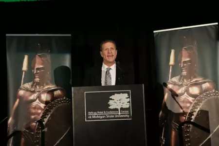 Alum Frank Finn was this year's recipient of the Distinguished Spartan Award. Finn, who donned the Green and White from 1978-82, was part of Ron Mason's first three teams at MSU. He helped the Spartans to their first CCHA Playoff title and the first of the program's nine consecutive NCAA Tournament appearances in his final season. Finn has gone on to a successful international business career that has included stops in Prague and London while with Pepsi and Shell Oil, respectively.