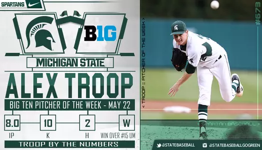 Troop pitched 8.0 innings in leading Michigan State to a 6-1 win over No. 15 Michigan on May 18 at McLane Stadium at Kobs Field. The sophomore left-hander took a perfect game into the sixth inning and a no-hitter into the seventh inning, chalking up 10 strikeouts while only allowing two hits, tying his career-highs for both Ks and hits allowed, in pitching eight innings. Troop held high-powered Michigan to its fewest hits of the season and its second-lowest run total.
