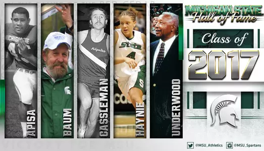 EAST LANSING, Mich. -- Michigan State will induct five Spartans into its Athletics Hall of Fame on Thursday, Sept. 28 as part of its annual "Celebrate" weekend, it was announced on June 22. The 2017 Hall of Fame class includes: Bob Apisa (football), Joe Baum (soccer), Bob Cassleman (track & field), Kristin Haynie (basketball) and Dr. Clarence Underwood (administration).