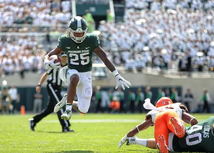 Michigan State marched down the field on the first drive of the game, only for LJ Scott to fumble the ball away near the goal line. The Spartans lost another fumble near midfield later in the quarter, but they finally took a 7-3 lead early in the second on a 7-yard touchdown run by Madre London.