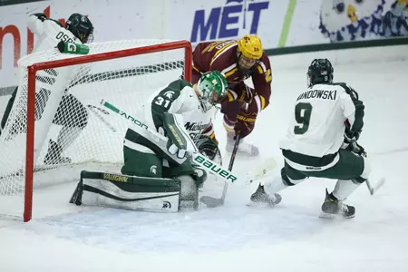The Spartans (9-15-1 overall, 3-11-1-1 Big Ten) trailed 4-1 seven minutes into the second period as Minnesota (14-12-1, 5-9-1-1) scored three goals within 5 minutes and 7 seconds -- one on the power play and two shorthanded on the same MSU power play.