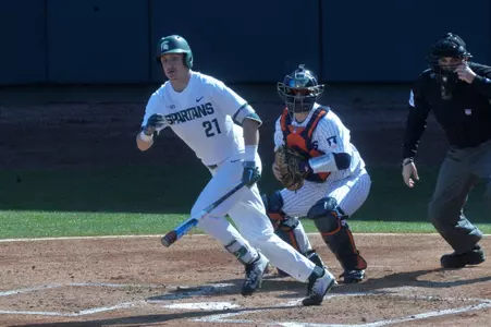 The Illini and Spartans both scored two runs apiece in the seventh, with Illinois scoring its two runs on a two-run home run by Bren Spillane. Gleaves sparked the Spartan rally in the home half of the frame with a leadoff single and later stealing both second and third, scoring on an RBI fielder's choice by Bechina and freshman first baseman Zach Iverson scoring on an Illinois error, making the score 14-5 after seven. Illinois tacked on three in the top of the eighth for the final scoring, but not before MSU threatened in the ninth, loading the bases with two outs, but the rally fizzled with a strikeout to end the game.